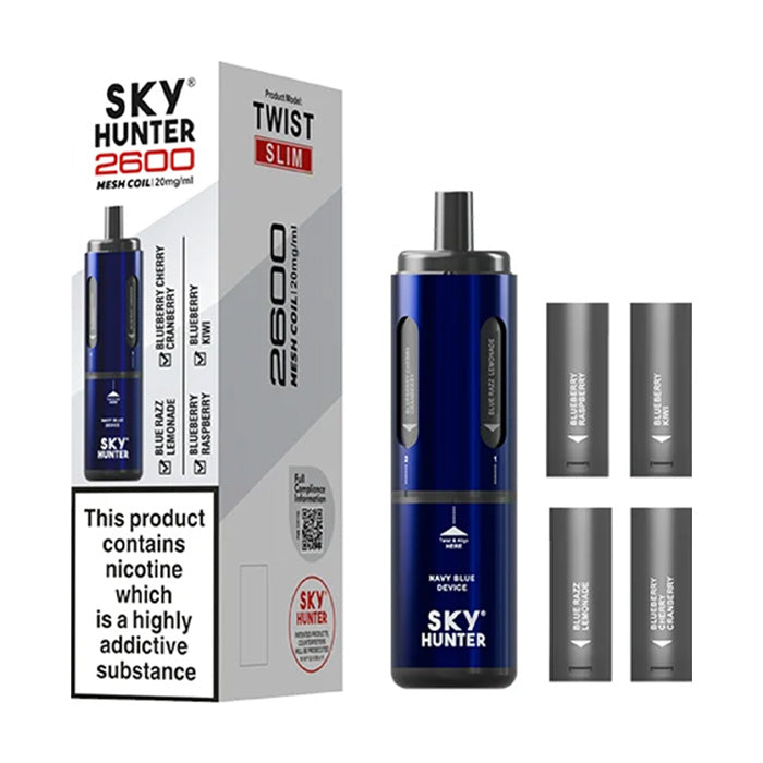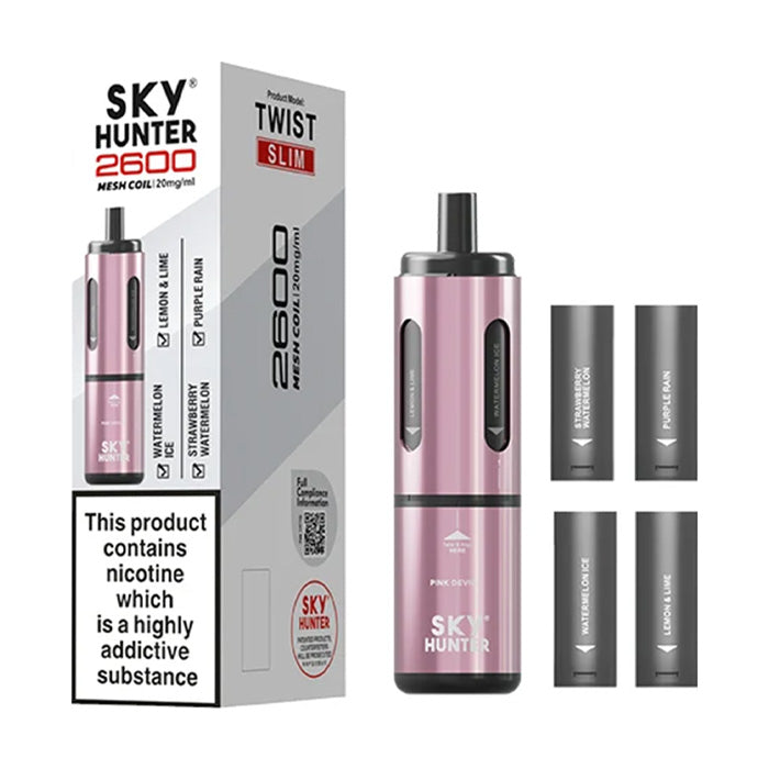 The Sky Hunter Twist 2600 Kit is a great replacement for disposables. Featuring 4 x 2ml pods and a rechargeable 650mAh battery, it provides a much less wasteful solution to vaping when compared to disposable vapes. Each pod is filled with 2ml of 20mg nic salt and you get 4 different flavoured pods in the box with the kit.